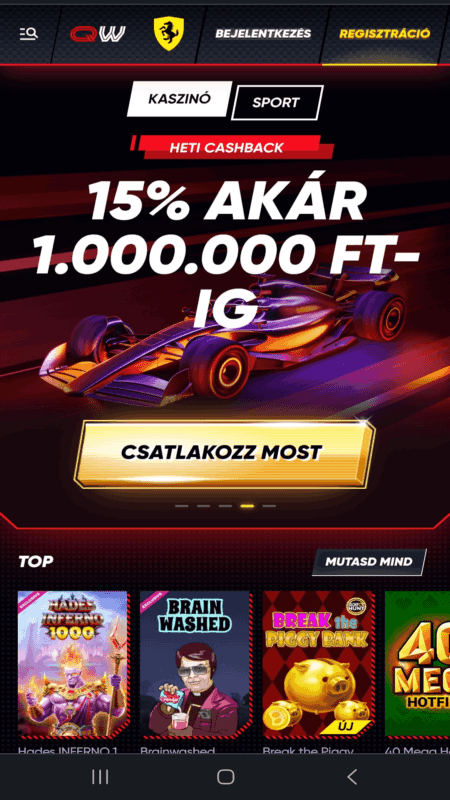 - Heti Cashback: 15%, akár 1.000.000 Ft-ig – mert veszíteni is lehet stílusosan, ha utána visszakapsz belőle.
