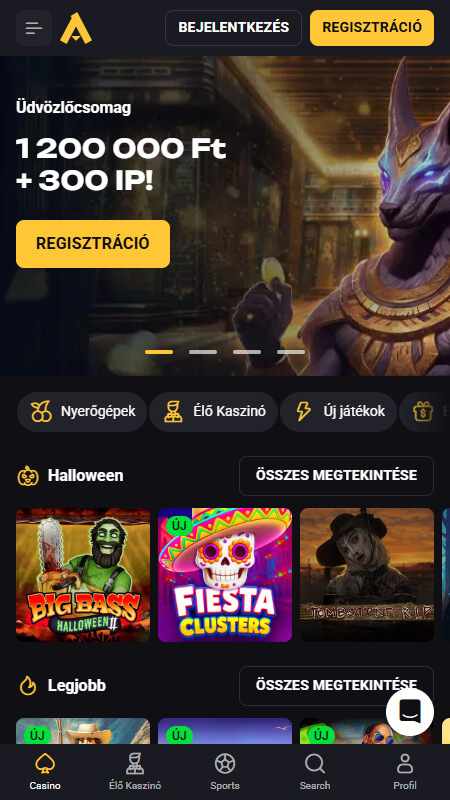 | 🎁 Bónusz | Üdvözlő csomag: 100% akár 1 200 000 HUF + 300 ingyen pörgetés |