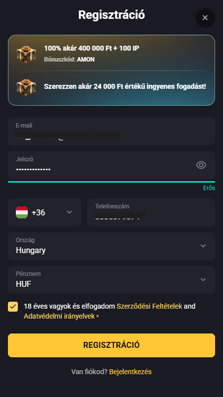 | 💰 Első Befizetési Bónusz | 100% akár 400 000 HUF-ig + 100 ingyenes pörgetés | Min. befizetés: 8.000 Ft, bónuszkód: AMON, 40x megforgatási követelmény, teljesítés: 7 napon belül |