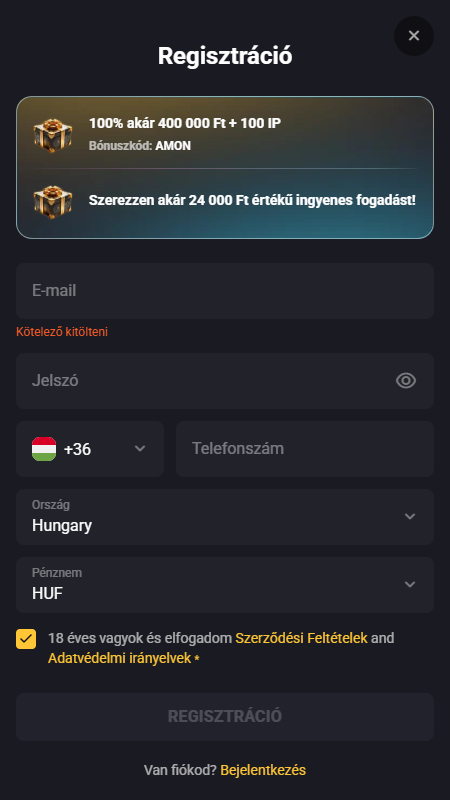 Az AmonBet regisztráció folyamata kifejezetten gyors és felhasználóbarát. Néhány lépés alatt létrehozhatod saját játékosfiókodat:
