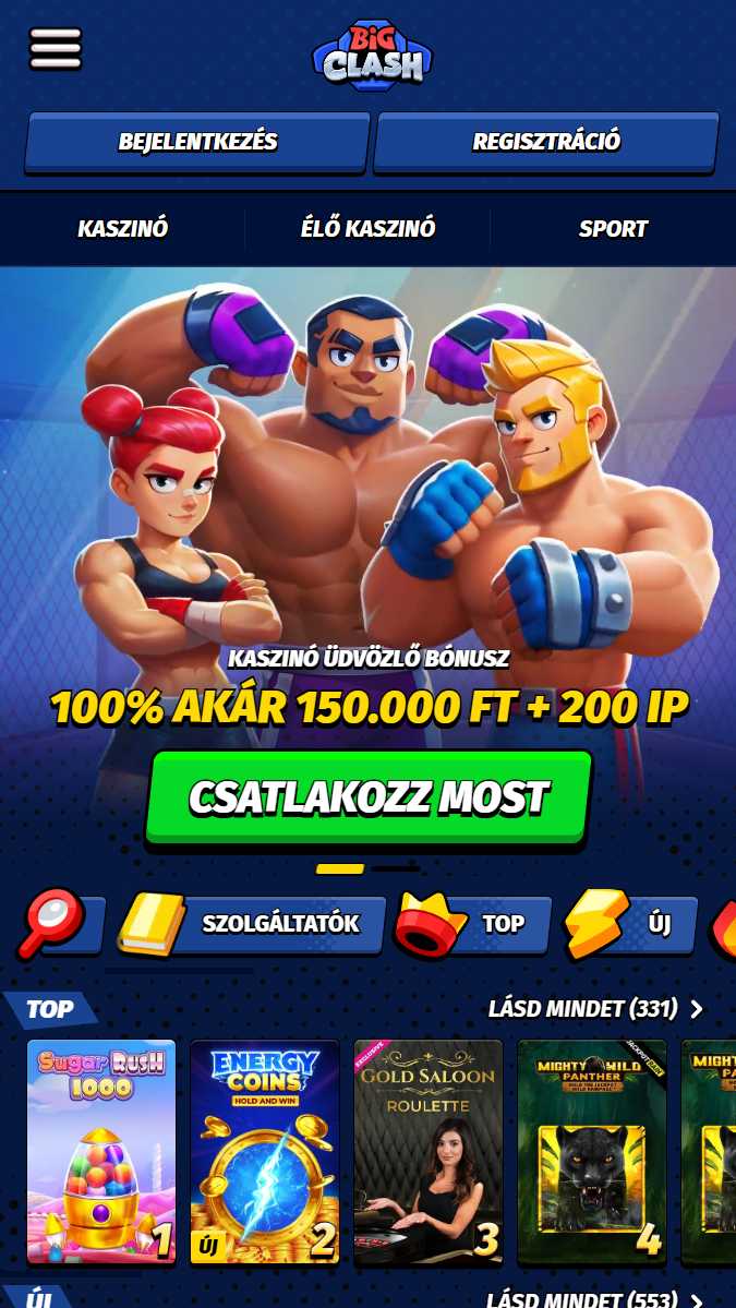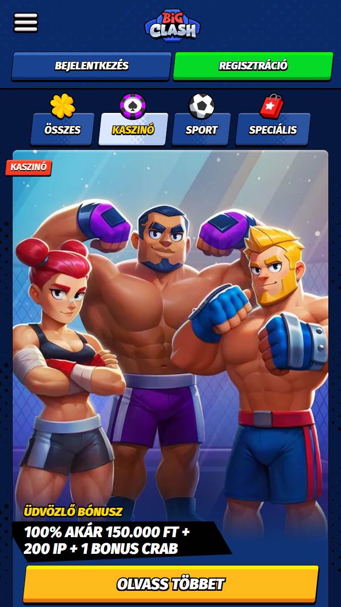 Ha most csatlakozol a BigClash Kaszinóhoz, egy igazán ütős kezdőcsomag vár rád: 200% bónusz akár 200 000 Ft-ig, mellé 200 ingyenes pörgetés, plusz még egy Bonus Crab kredit is jár. Ez a bónuszcsomag remek lehetőség arra, hogy nagyobb lendülettel indulj neki a játéknak.