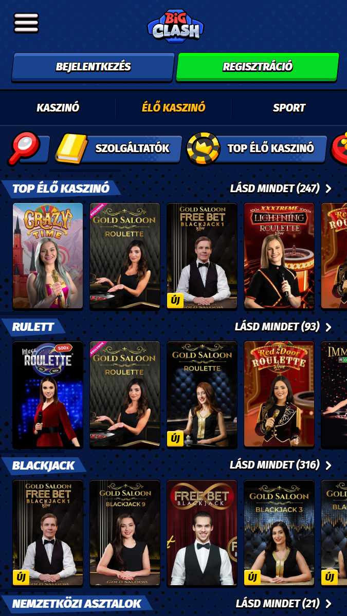 A BigClash élő kaszinó részlege kiemelkedő, főként Evolution és más top szolgáltatók (pl. BetGamesTV) által, amelyek élő rulett, blackjack, póker, baccarat és egyéb élő műsorokat kínálnak. Asztalok száma eléri a 100+ különféle élő játékot, kiterjedt élő tartalommal.