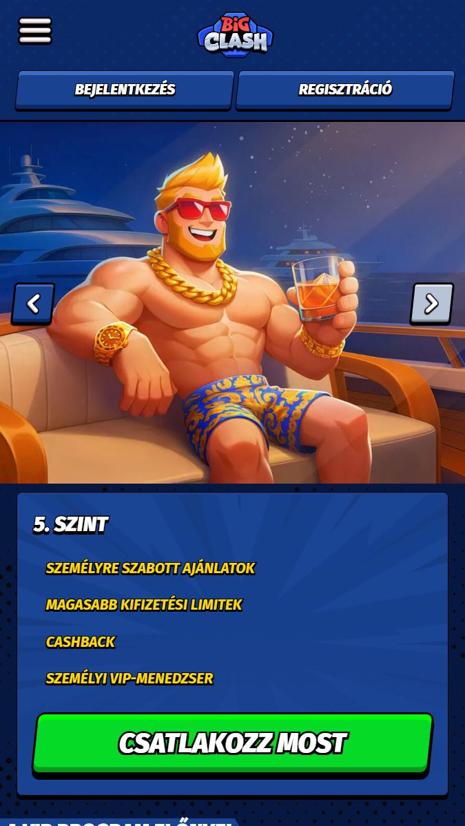 A BigClash hűségprogramja egy 5 szintes VIP rendszer, amely folyamatosan jutalmazza az aktív játékosokat. Már az első napon belépsz az 1. szintre, és ahogy játszol, haladsz felfelé. Minden szinten extra előnyök várnak: