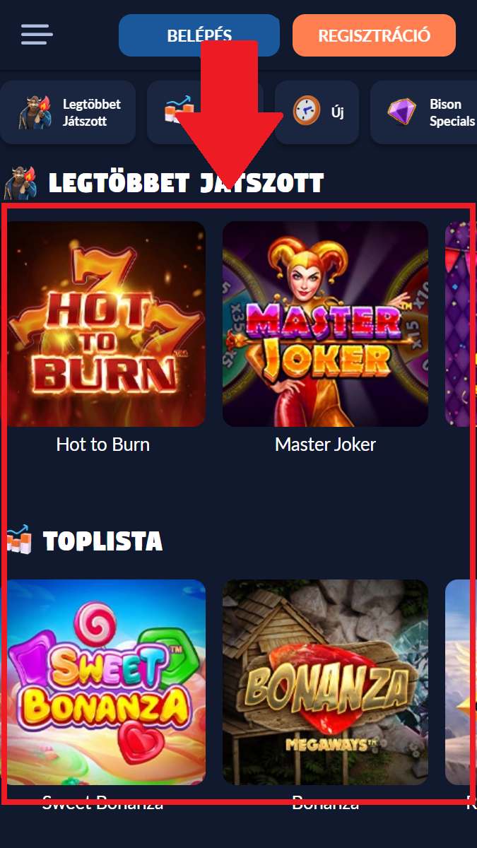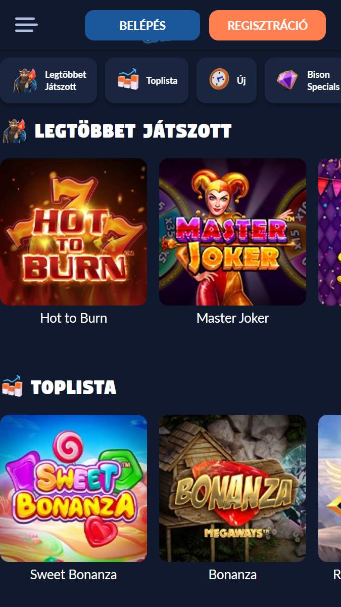Tipp: A weboldal hozzáadható a kezdőképernyőhöz Android és iOS készülékeken egyaránt. Így egyetlen érintéssel indítható a kaszinó, teljes képernyős nézetben, gyorsabb hozzáférést biztosítva a játékokhoz, bónuszokhoz és befizetésekhez. Ez a lehetőség sok felhasználó számára kényelmes alternatívát jelent a hiányzó hivatalos Bison app helyett.