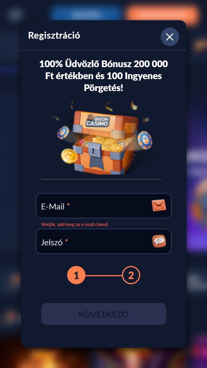 A regisztráció a Bison kaszinóban egyszerű és gyors folyamat, amely mindössze néhány percet vesz igénybe. A játékosok már az első befizetés után igénybe vehetik a bónuszokat és elérhetik a többezer játékból álló kínálatot. Az alábbi lépések segítségével könnyedén elindulhatsz: