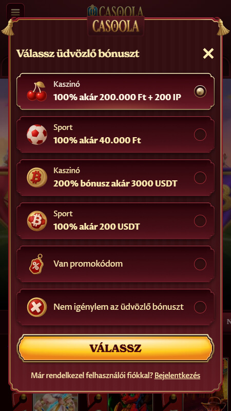 | 🎁 Üdvözlő bónusz | 100% akár 200 000 Ft + 200 IP | Min. befizetés: 6000 Ft. A befizetési bónusz megforgatása: 35x (bónusz + befizetés). Az ingyen pörgetésekből származó nyeremény megforgatása: 40x. A bónusz feltételeit 10 napon belül kell teljesíteni. |