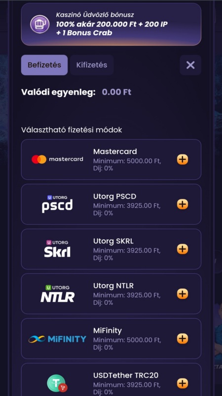 A regisztráció és bejelentkezés folyamata igazán egyszerű, a felület nem dobál el felesleges hibaüzeneteket, és nem is próbál minden kattintás után újratölteni mindent. A fiók kezelése, adatok, kifizetések, bónuszok, egyetlen menüből elérhető, és tényleg jól szervezett. A tranzakciók állapotát nyomon lehet követni, és minden egyes befizetéshez megjelenik a bónusz lehetőség is, átláthatóan, egyértelműen.