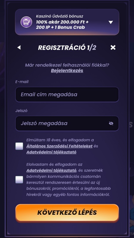 | 🎁 Üdvözlő csomag | 100% akár 200.000 Ft + 200 IP + 1 Bonus Crab |