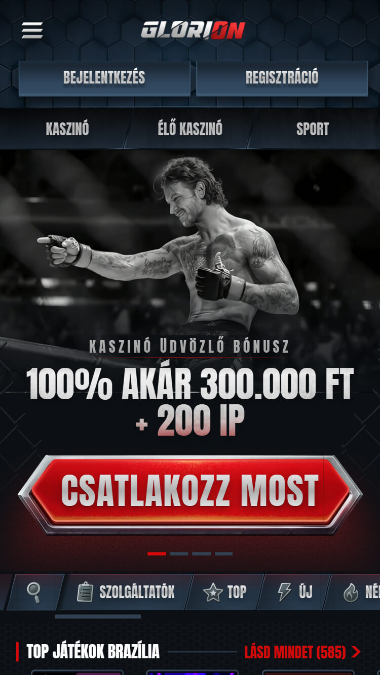 A Glorion kaszinó felülete első látásra is céltudatos. Nincs felesleges mozgás, nincs túlpakolt grafika, minden pontosan ott van, ahol lennie kell. A sötét háttér stabil alapot ad a színes játékdobozoknak, így a szem nem fárad, a figyelem pedig nem kalandozik el. A főmenü bal oldalt áll, fix pozícióban, mint egy megbízható útitárs. A kategóriák egyértelműek: kaszinó, élő játékok, sportfogadás, jackpot, VIP, nincs kavarodás, csak letisztult logika.