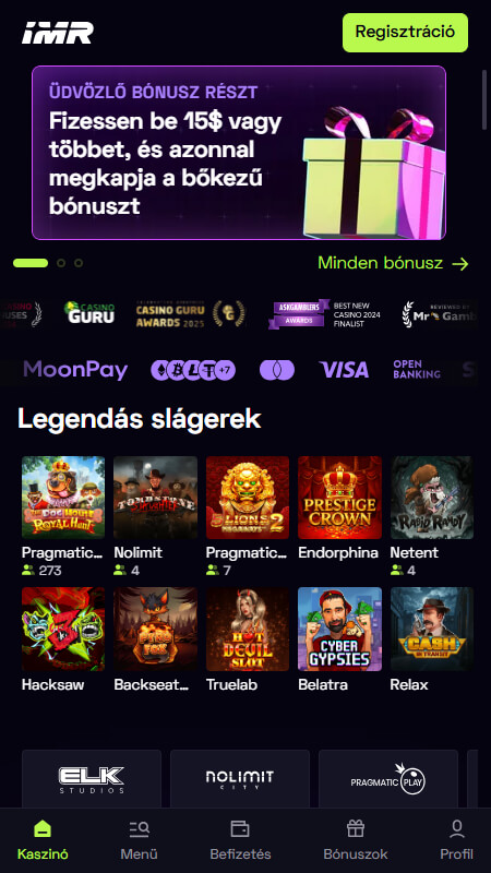 Egy modern, gyorsan növekvő online játékplatform az Immerion kaszinó. 2024-es indulása óta folyamatosan bővíti a játékok kínálatát. A kaszinó célja, hogy egyszerre kínáljon hatalmas játékélményt és kényelmes felhasználói környezetet. Az oldal több mint 10 000 játékkal, korszerű fizetési megoldásokkal és kriptovaluta-támogatással várja a játékosokat. A platform egyik legnagyobb vonzereje a rendkívül bőkezű üdvözlő csomag, amely akár 250% bónuszt és 250 ingyenes pörgetést kínál az új felhasználóknak. Bár külön alkalmazás nem érhető el, a weboldal kiválóan optimalizált mobilra. Így minden funkció könnyedén használható útközben is. Az Immerion emellett komoly iparági elismeréseket is gyűjtött, több rangos díj döntőse és nyertese lett, ami erősíti a márka megbízhatóságát.