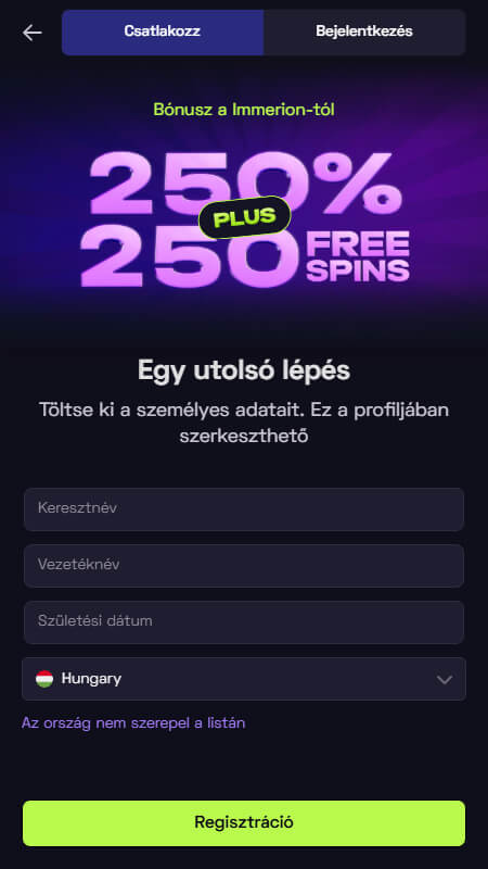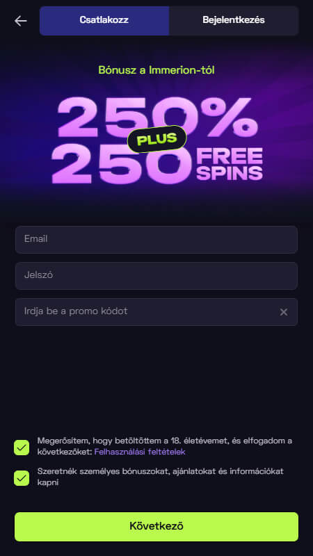 A következő lépések bemutatják, hogyan lehet regisztrálni az Immerion kaszinóban:
