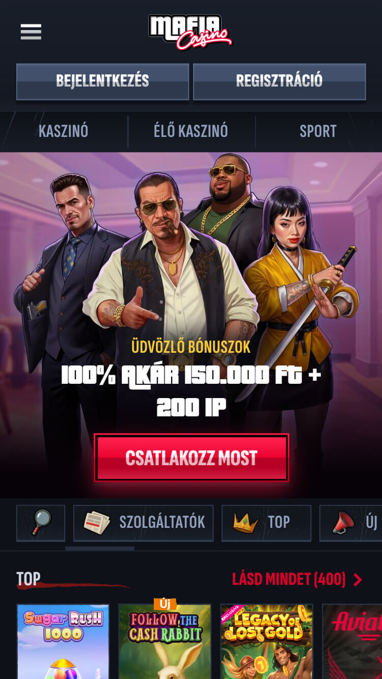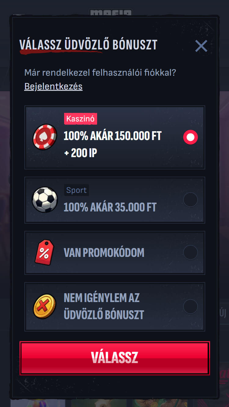Aki először lép be a Mafia Casino digitális előterébe, nemcsak egy új fiókot nyit, hanem egy meglehetősen gáláns kézfogást is kap az oldal részéről: 100% bónuszt, akár 150.000 forintig, mellé pedig 200 ingyen pörgetést. Egy új játékos ezzel a csomaggal nemcsak duplán vághat bele a kalandba, hanem rögtön kap egy teljes, színes, csilingelő ízelítőt a kaszinó kínálatából, hiszen az IP-k szépen kiemelnek egy-egy különleges nyerőgépet is, amiben ott a lehetőség egy-egy korai sikertörténetre.