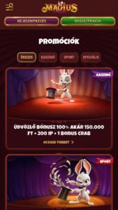 Innen már nyitva a világ: több ezer játék, különféle bónuszok, versenyek és cashback vár rád. Ha pedig csak kipróbálnád, a Bonus Crab mini-bónuszhoz elég 3.000 Ft-ot befizetned. A Magius regisztráció egyszerű, gyors, és ha jól állsz hozzá, kifejezetten szórakoztató már az elején is.