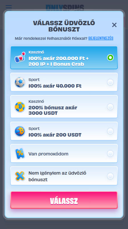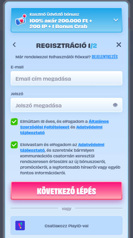 | 🎁 Üdvözlő bónusz | 100% akár 200.000 Ft + 200 IP + 1 Bonus Crab |