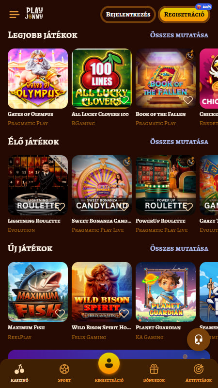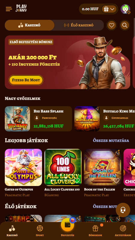 A Playjonny kaszinó több mint 5000 játékkal vár, és kínálata nemcsak hatalmas, de kifejezetten figyelemre méltó is. A legnépszerűbbek közé tartoznak a népszerű nyerőgépek, mint a Gates of Olympus, Sweet Bonanza vagy a Big Bass Bonanza, amelyek magas RTP-vel és látványos bónuszfunkciókkal rendelkeznek. Ezeket olyan vezető fejlesztők készítették, mint a Pragmatic Play, NetEnt, BGaming vagy a Spinomenal.