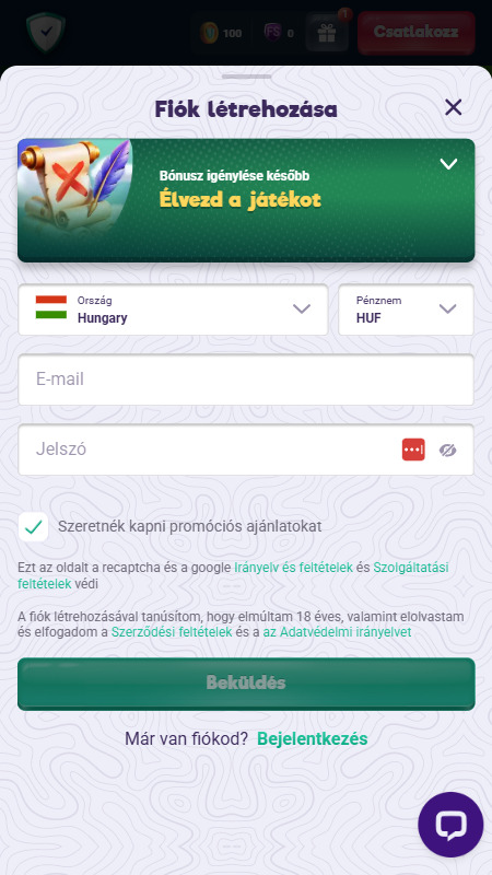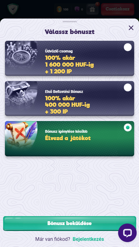 | 💰 Első Befizetési Bónusz | 100% akár 400 000 HUF-ig + 300 ingyenes pörgetés | Min. befizetés: 4.000 Ft, 40x megforgatási követelmény, teljesítés: 30 napon belül |