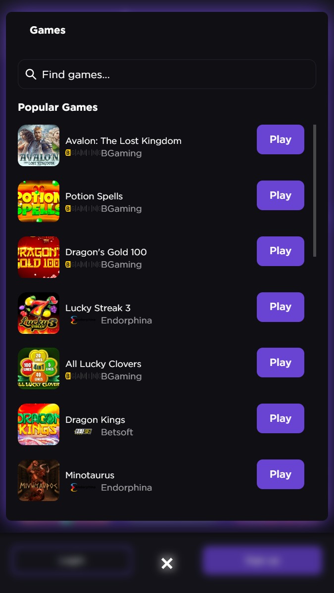 A platform modern, gördülékeny, külön letölthető alkalmazást ugyan nem kínál, de a mobilos böngészős verzió stabil, gyors, és minden funkció elérhető rajta. A játékfelhozatal már első ránézésre is lenyűgöző: több mint 5000 játék, köztük ezerféle nyerőgép, több száz élő osztós és asztali játék, valamint instant játékok is színesítik a kínálatot. A szolgáltatói lista hosszú, 80-nál is több nevet tartalmaz.