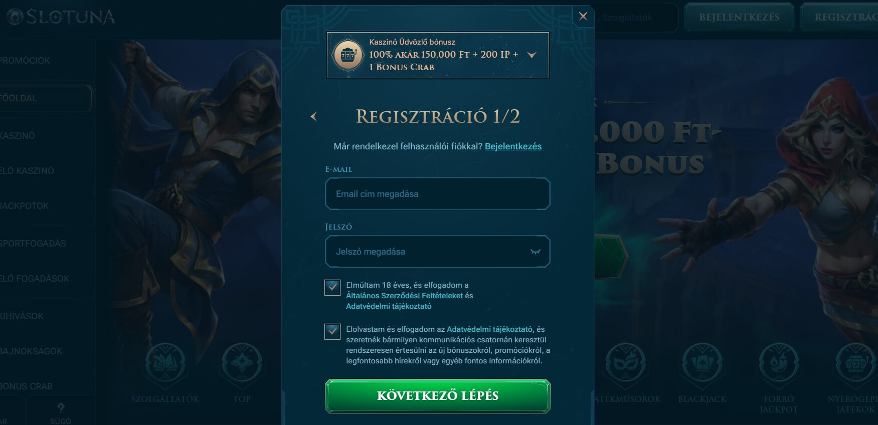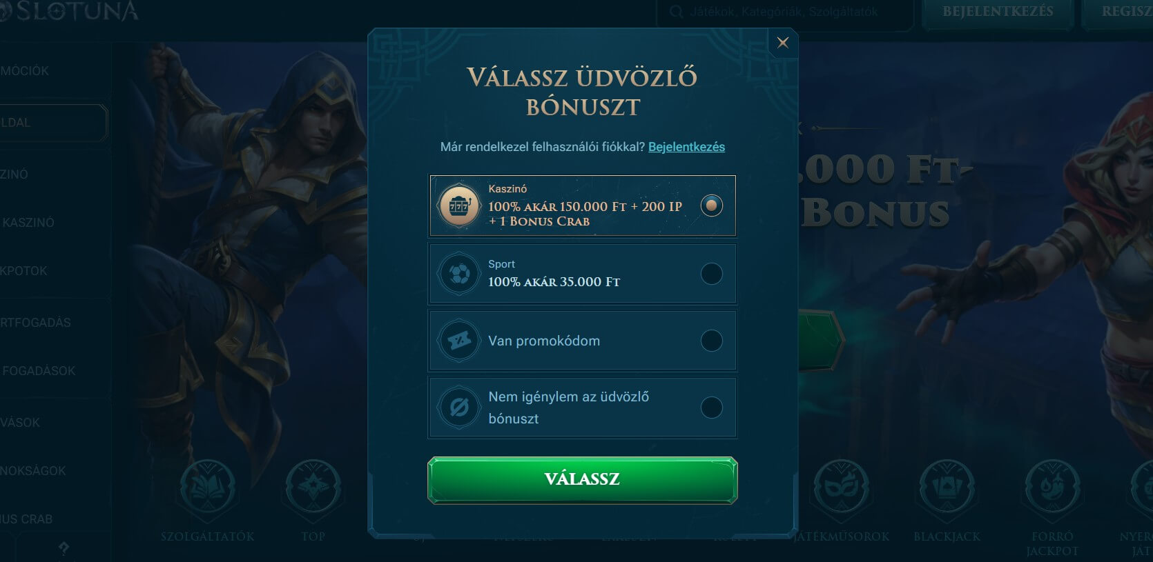 A Slotuna kaszinóban minden bónusz egy újabb legendás küldetés, ahol a szerencse hősei mesés jutalmakra lelhetnek. Az Üdvözlő Bónusz varázslatos 150.000 Ft-ig 100%-os erővel ruház fel, 200 ingyen pörgetéssel és egy titokzatos Bonus Crabbal, hogy kalandjaid rögtön epikus fordulatot vegyenek.