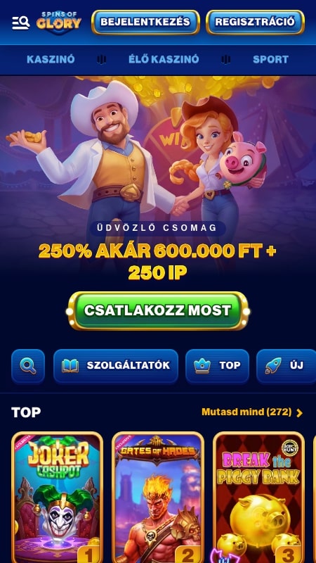 A SpinsOfGlory Kaszinó weboldala első ránézésre is rendben van; letisztult, logikus, és nem zúdít rád egyszerre ezer dolgot. De az igazi erénye az, ahogy használni lehet. Betölt, működik, nem húz, nem szakad, és nem kér elnézést a hibákért, mert azok egyszerűen nincsenek. A navigáció egyértelmű, minden ott van, ahol keresnéd: játékok, bónuszok, pénzügyek, ügyfélszolgálat. Nem akarnak trükközni a figyelmeddel, inkább hagyják, hogy te válaszd meg az utadat.