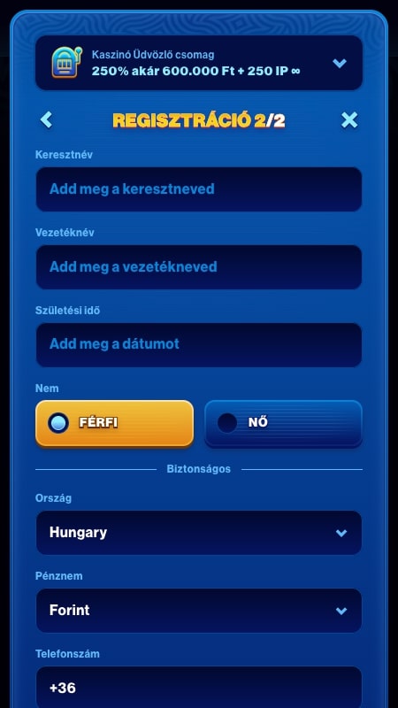 | 🎁 Üdvözlő csomag | 250% bónusz max. 600 000 Ft + 250 IP | Minimum befizetés: 6000 Ft; bónusz + befizetés megforgatása 35x, pörgetések nyereménye 40x; 10 nap határidő |