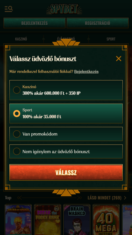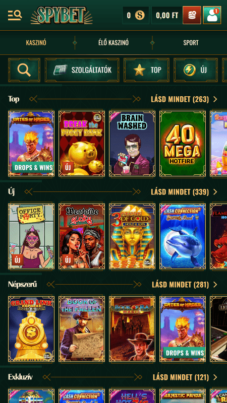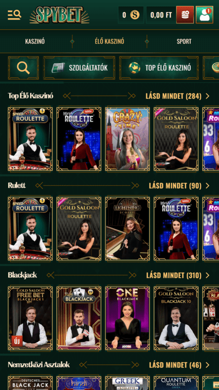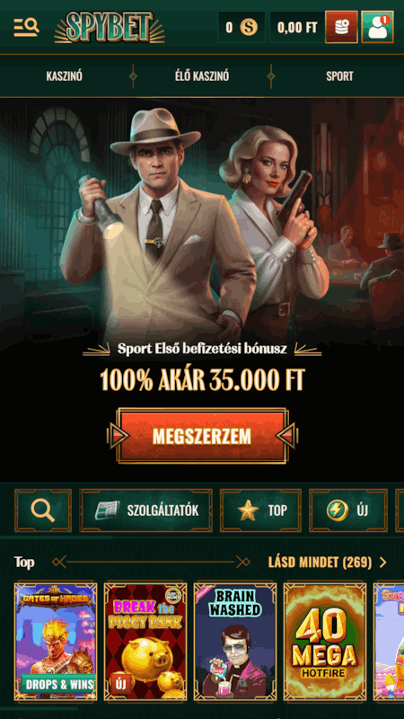 A SpyBet nem akar többnek látszani, mint ami – de amit vállal, azt látványosan teljesíti. Már az első pillanatban érzed, hogy itt valami mással van dolgod: a zöld-arany színkombináció, az elegáns háttér minta, a letisztult menük nem csak szépek, hanem irányítanak is.