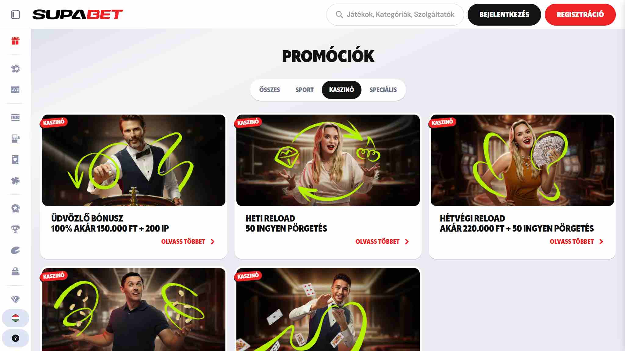 A hétvégi reload még vadabb: akár 220.000 Ft + 50 pörgetés péntektől vasárnapig, ha 15.000 Ft-ot raksz be. A VIP-játékosok 15%-os heti cashbacket is kapnak, míg az Élő Kaszinó fanatikusai 25%-ot visszanyerhetnek! De figyelem: ezek nem ingyen pénzek – a megforgatási követelmények kemények, ezért érdemes előre megtervezni a taktikát. Ha jól játszol, a Supabet bónuszai aranybányává változtatják a játékodat!