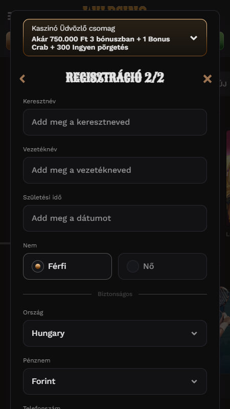 | Bónusz | 250% akár 750.000 Ft + 1 bonus crab + 300 IP |